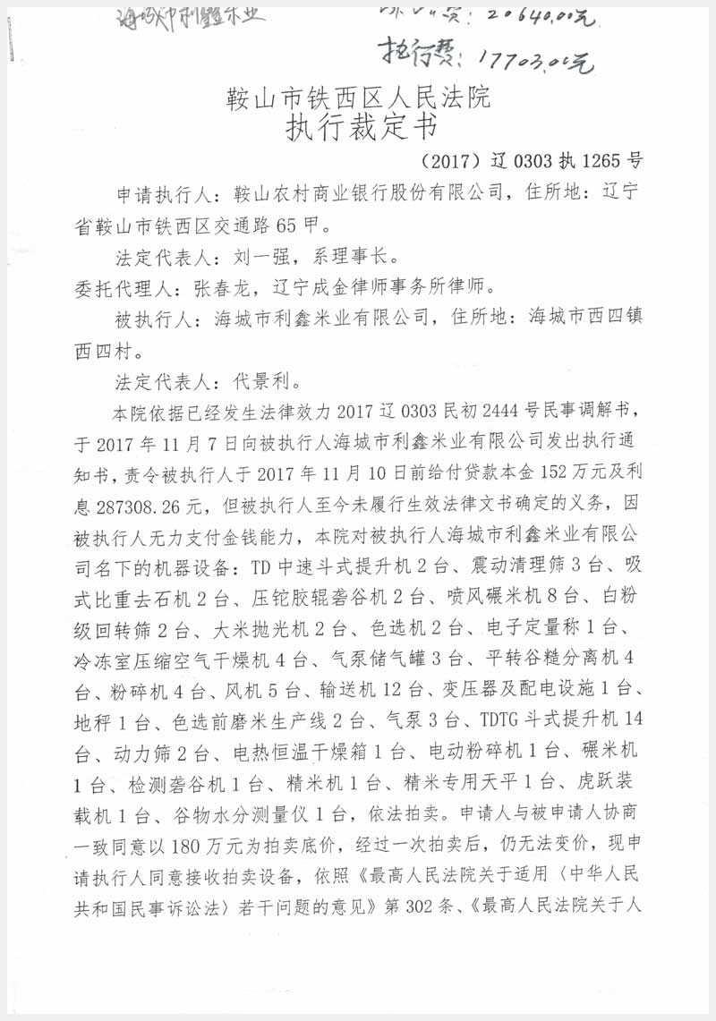 名稱:海城市利鑫米業(yè)有限公司所有的機器設(shè)備 面積:87臺 瀏覽次數(shù):1999