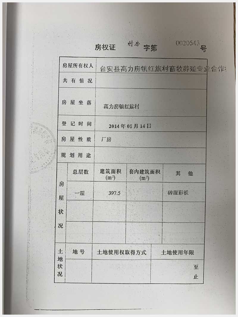 名稱:臺(tái)安縣高力房鎮(zhèn)紅旗村畜牧養(yǎng)殖專業(yè)合作社 面積:房產(chǎn):10559.98㎡、土地:19807.47㎡ 瀏覽次數(shù):1450
